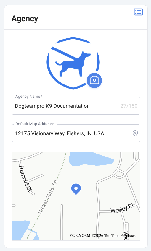 Click on the camera icon to upload your agency's logo, edit your agency's name, and add a default map address.