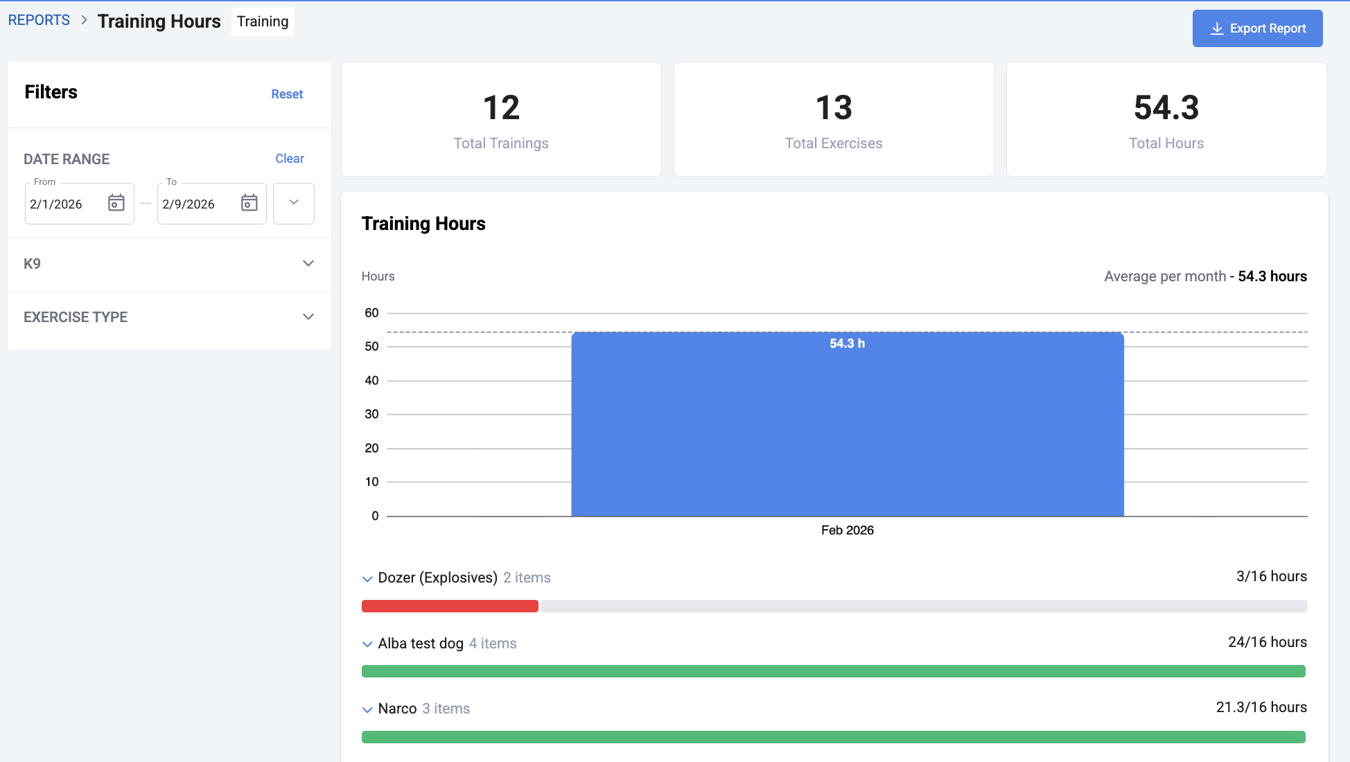 The Training Hours report provides a detailed view of the hours each K9 has spent training, helping you identify trends and track recommended training hours. Results can be filtered by date range, K9, or exercise type.