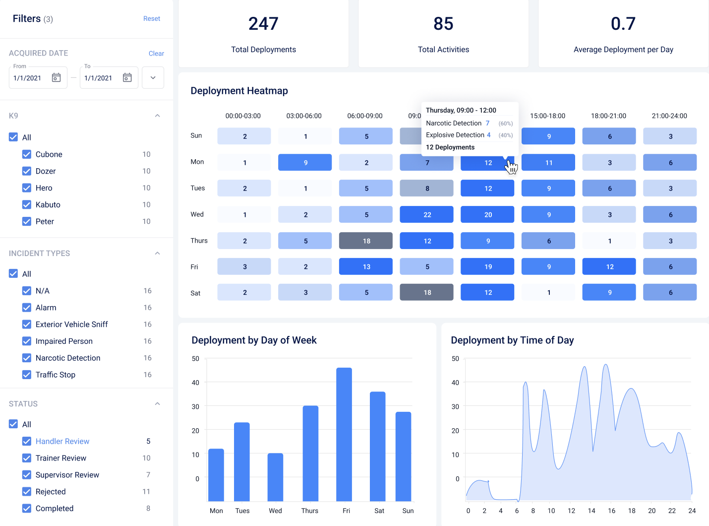 Gain a clear visual of when K9 deployments occur most often, making it easy to identify peak periods and daily workload patterns. Use these insights to spot trends, optimize staffing, and allocate resources with confidence.