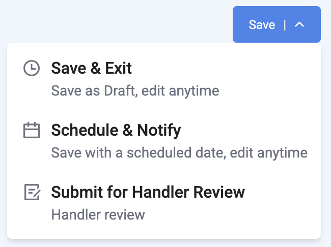 - Submit for Handler Review: This option will send the log to each handler for review. Don't click this option unless you are done editing the log and want the handler's to add their own information.