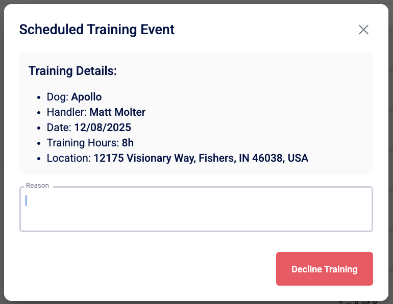 If you can't make it to an event, you can decline using the link in the email invitation, or you can log into Dogteampro, select the event from the list of upcoming events, and select "Decline Training" or "Decline Deployment".