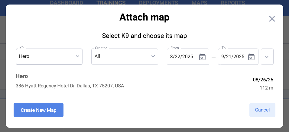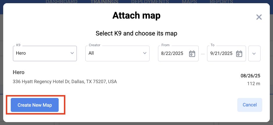 From here, you can either search for an existing handler map using the K9 and date filters, or create a new map.